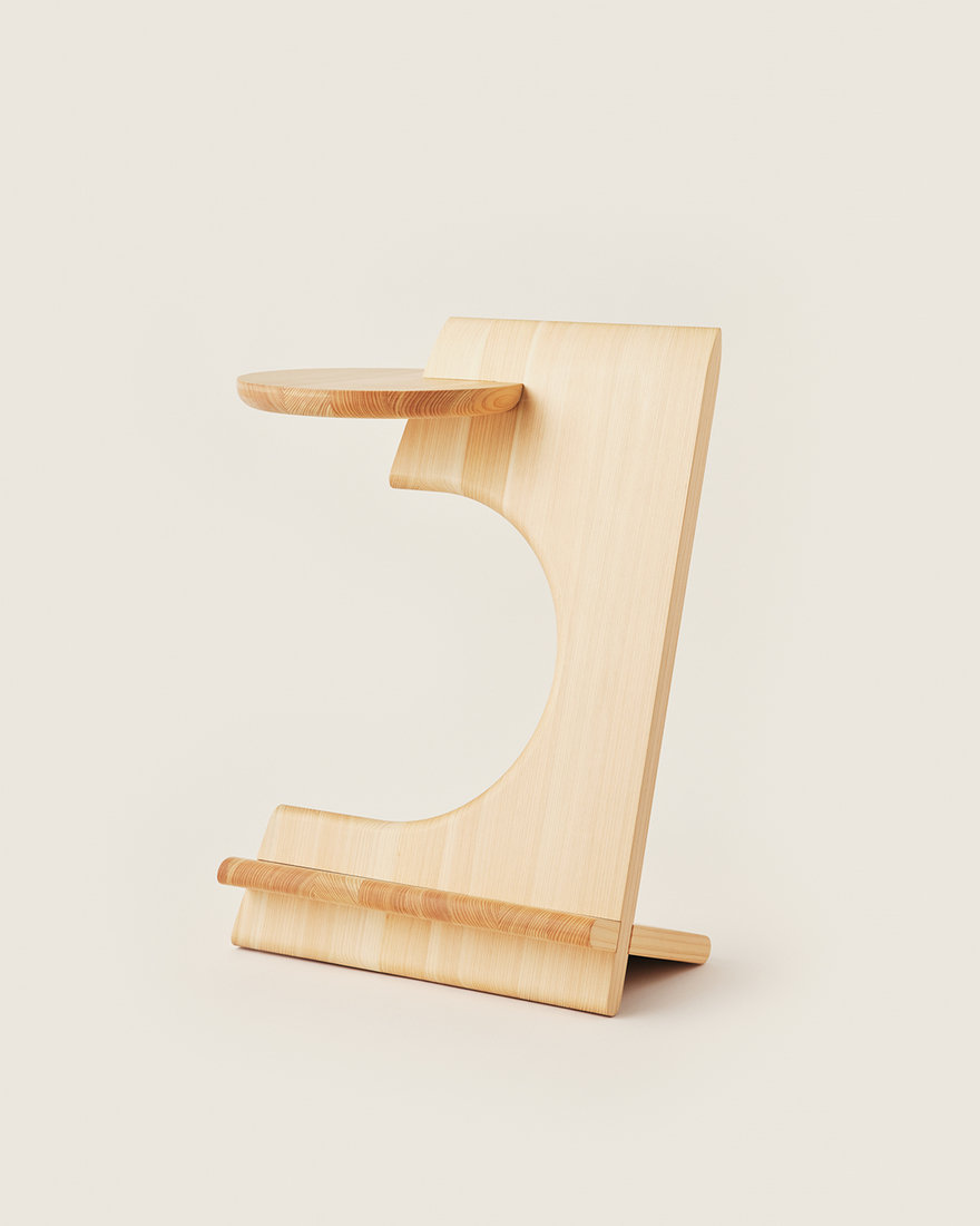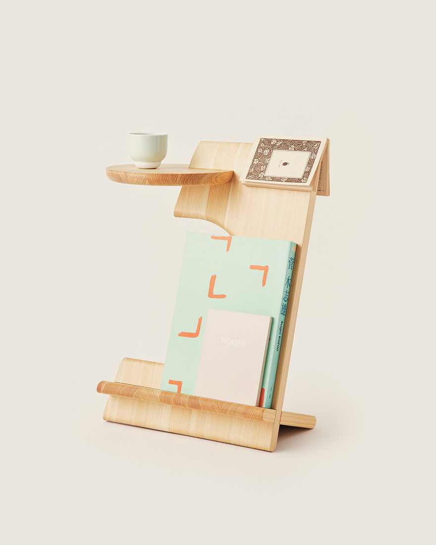 북마커는 수직으로 적층된 일본 삼나무로 효율적으로 절단된 세 부분으로 구성되어 있으며, 평면 포장이 가능하다. 우연인지 필연인지, 상단 패널을 낭비 없이 절단함으로써 형성된 형태는 이 가구의 독특한 개성을 정의하게 되었고, 사용자 측면과 외부에서 모두 책에 쉽게 접근할 수 있도록 한다.
