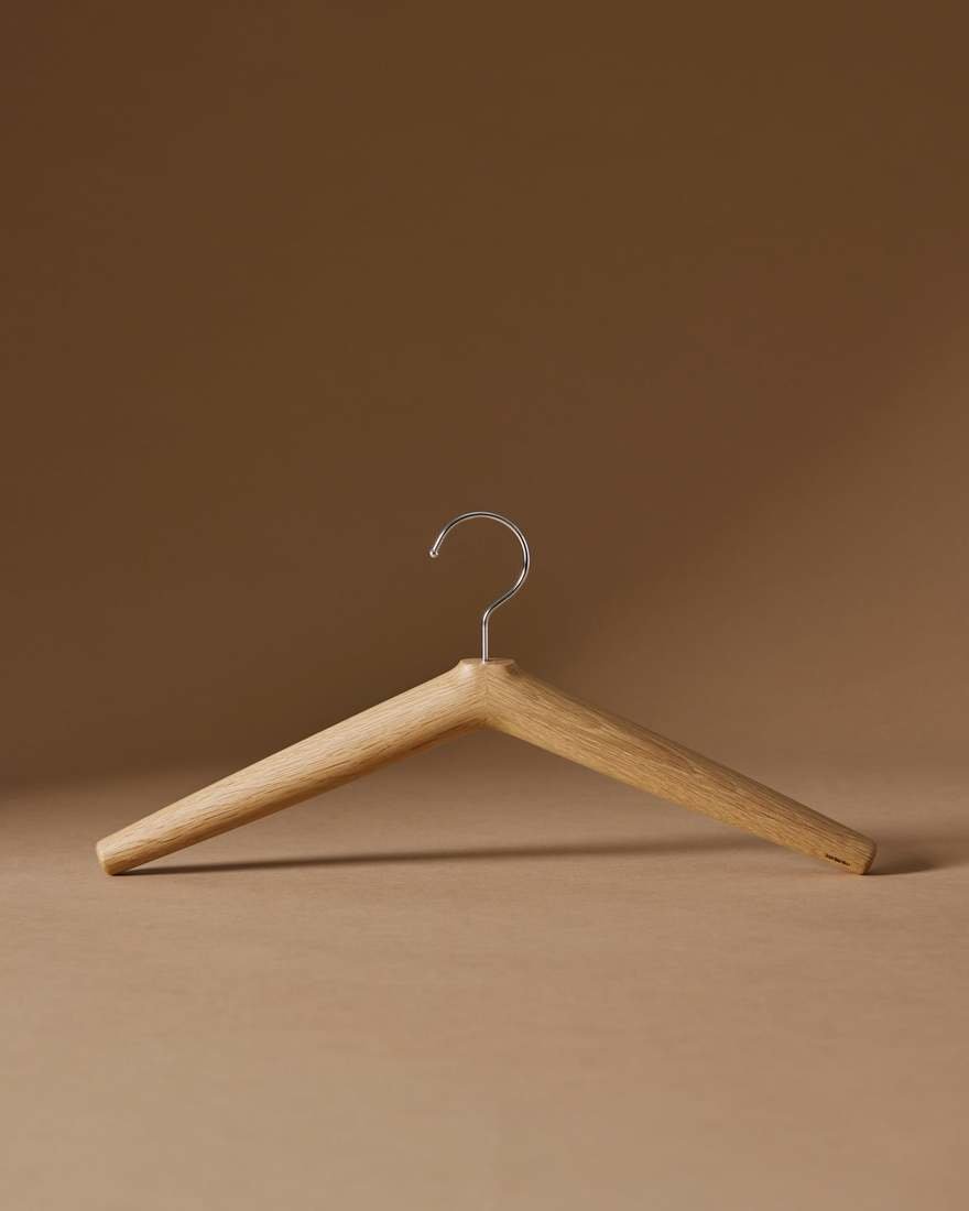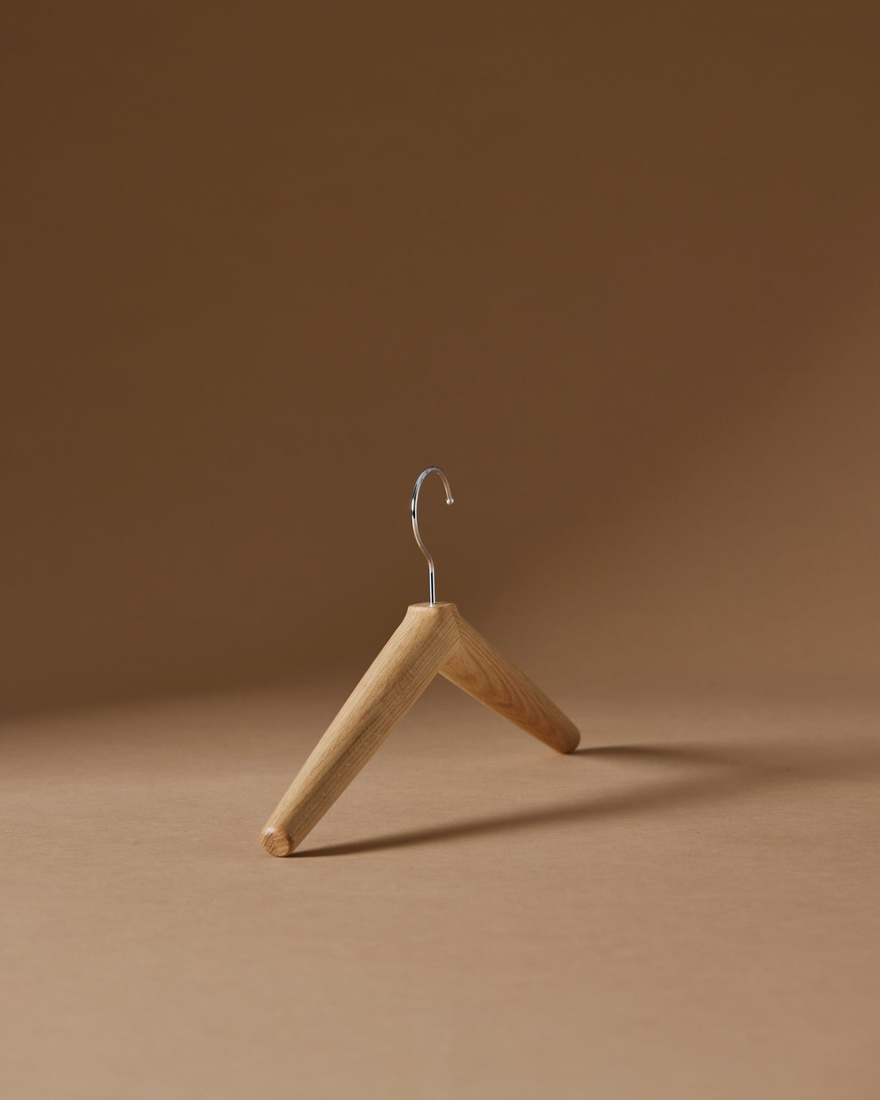 "이 행거는 양쪽 끝으로 기울어지는 직선으로 특징지어지며, 적절한 행거 각도, 나무의 두께와 곡률을 반복적으로 테스트하고 조정하여 완성되었습니다. 우리는 옷이 미끄러지지 않으면서도 손상되지 않도록 부드럽게 잡아줄 수 있는 각도를 찾고자 했습니다. 또한, 옷의 형태가 변형되지 않도록 적절한 두께를 테스트했습니다. 게다가, 표면은 장인들에 의해 세심하게 연마되어 만졌을 때 편안함을 제공하고 옷이 걸리지 않도록 방지합니다."
