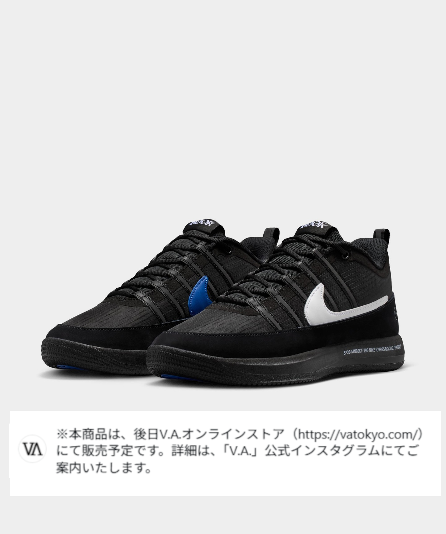 fragment design과 NIKE의 협업 제품인 NIKE BOOK 2가 2026년 2월 14일에 출시될 예정이다. 이 제품은 NBA 선수 Devin Booker의 두 번째 시그니처 모델로, 아Upper에는 기존 모델과는 다른 부드러운 나일론 소재가 사용되어 현대적인 느낌을 준다. 스우시 로고는 흰색과 파란색의 비대칭 컬러로 디자인되었으며, 신발의 태그와 힐 측면에는 천둥 모티프가 적용되었다. 미드솔에는 디자인 코드가 새겨져 있다. 2026년 2월 14일에 일본 도쿄의 V.A.에서 한정 판매될 예정이다. 판매 가격은 22,660엔이다.