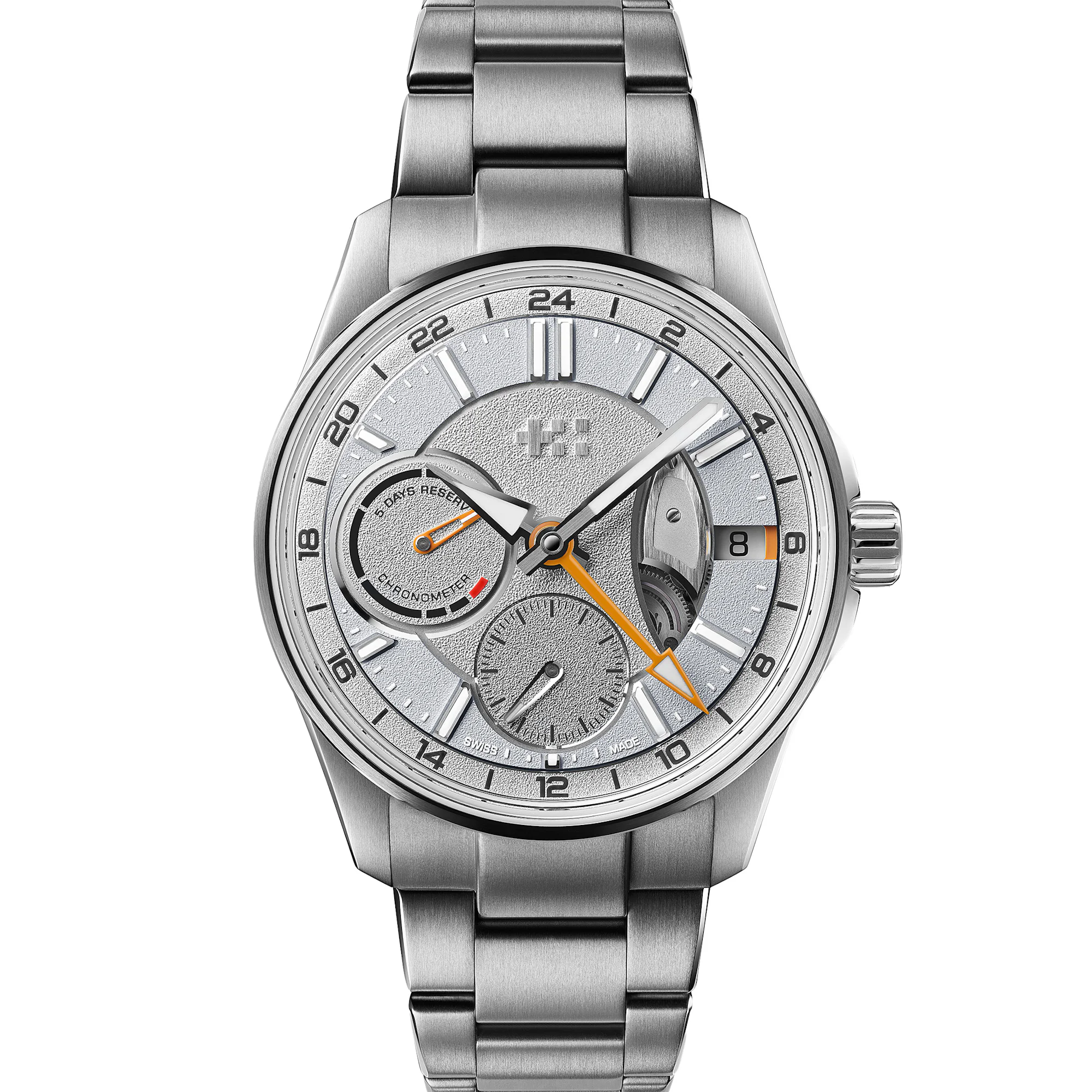 크리스토퍼 워드의 C63 트루 GMT 모델은 여행자들을 위한 로컬 점프 시간 핸드를 추가하여 주목받고 있다. 이 시계는 40.5mm 스테인리스 스틸 케이스에 수용되어 있으며, 그레인 텍스처의 다이얼은 6시 방향에 작은 초침과 9시 방향에 파워 리저브 인디케이터를 포함하고 있다. 3시 방향의 날짜 창 옆에는 GMT 브리지를 포함한 무브먼트의 일부가 드러나는 컷아웃이 있다. 이 시계는 고정 베젤을 갖추고 있어 여행 시 유용한 레이아웃을 제공한다.