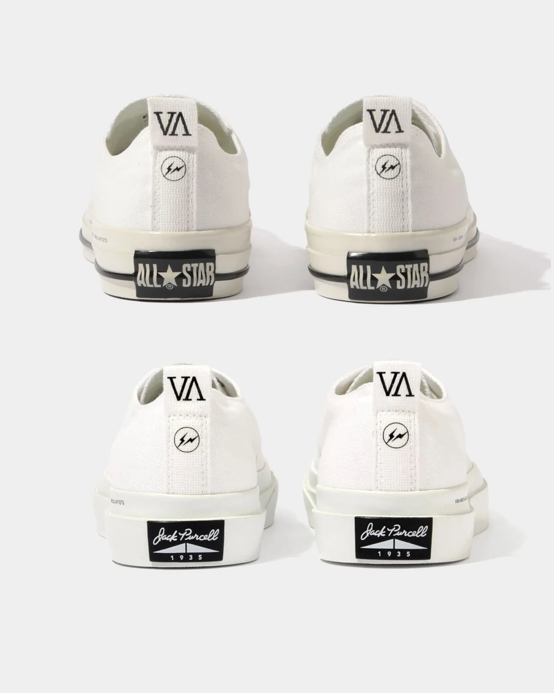 디자인 집단 프래그먼트 디자인이 이끄는 팀과 원주율의 컨셉 스토어 V.A., 그리고 CONVERSE가 협력하여 새로운 트리플 콜라보 스니커즈 'ALL STAR AGED OX & JACK PURCELL 1935 “White”'를 2026년 3월 10일에 출시했다. 이 스니커즈는 브랜드의 클래식한 감성을 담아내며, JACK PURCELL 1935를 기반으로 한 모델이다. 2025년 6월에는 V.A.에서 JACK PURCELL 1935의 블랙 컬러가 한정 출시되었으며, 이는 브랜드의 90주년을 기념한 제품이다. 이번 신제품은 ALL STAR AGED OX와 JACK PURCELL 1935를 결합하여 디자인되었다. ALL STAR AGED OX의 뒤꿈치 끈에는 프래그먼트와 V.A.의 로고가 새겨져 있으며, 테이프 부분에도 두 브랜드의 로고와 아이템 코드가 인쇄되어 있다. 또한, 허리 쪽 라이닝에는 협업 라벨이 부착되어 있어 스티치가 외부에서 보이는 디자인으로 마무리되었다. JACK PURCELL 1935 모델 역시 외부 허리 쪽 라이닝에 협업 라벨이 부착되어 있으며, 스티치가 외부에서 보이는 형태로 디자인되었다. 뒤꿈치 끈과 인솔에는 V.A.와 프래그먼트의 썬더 로고가 새겨져 있으며, 테이프에는 브랜드 및 모델 코드 번호가 인쇄되어 있다. 이 스니커즈는 V.A. 온라인 스토어에서 3월 10일 오전 10시부터 구매할 수 있다.