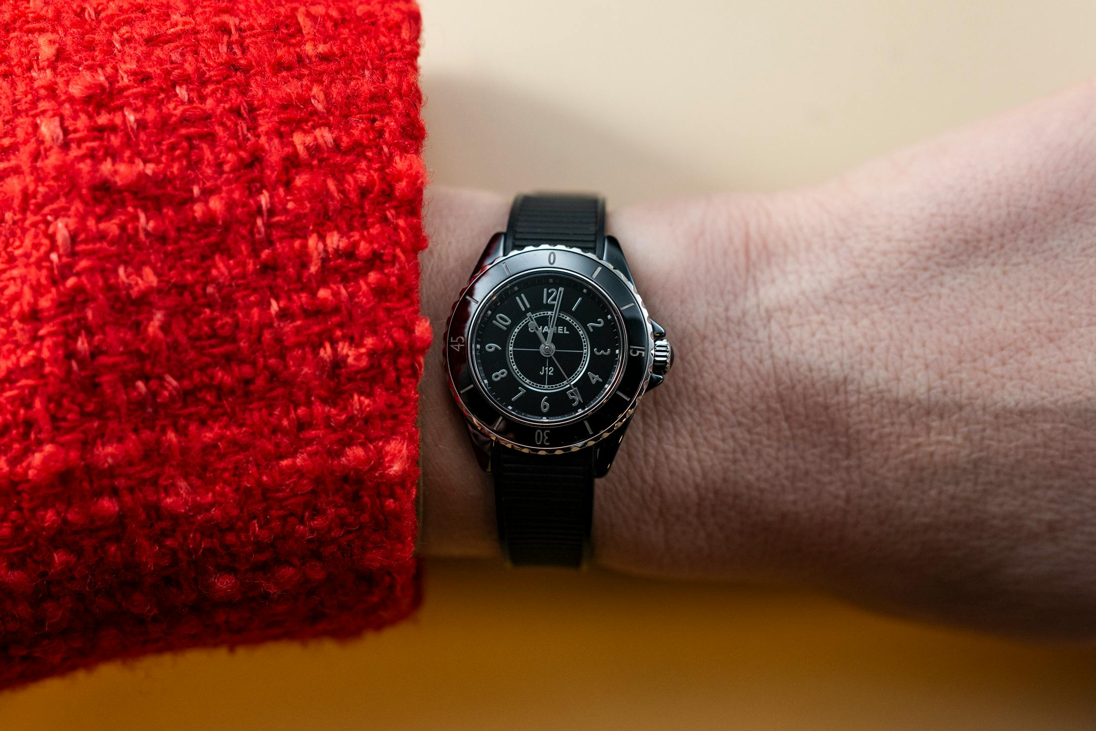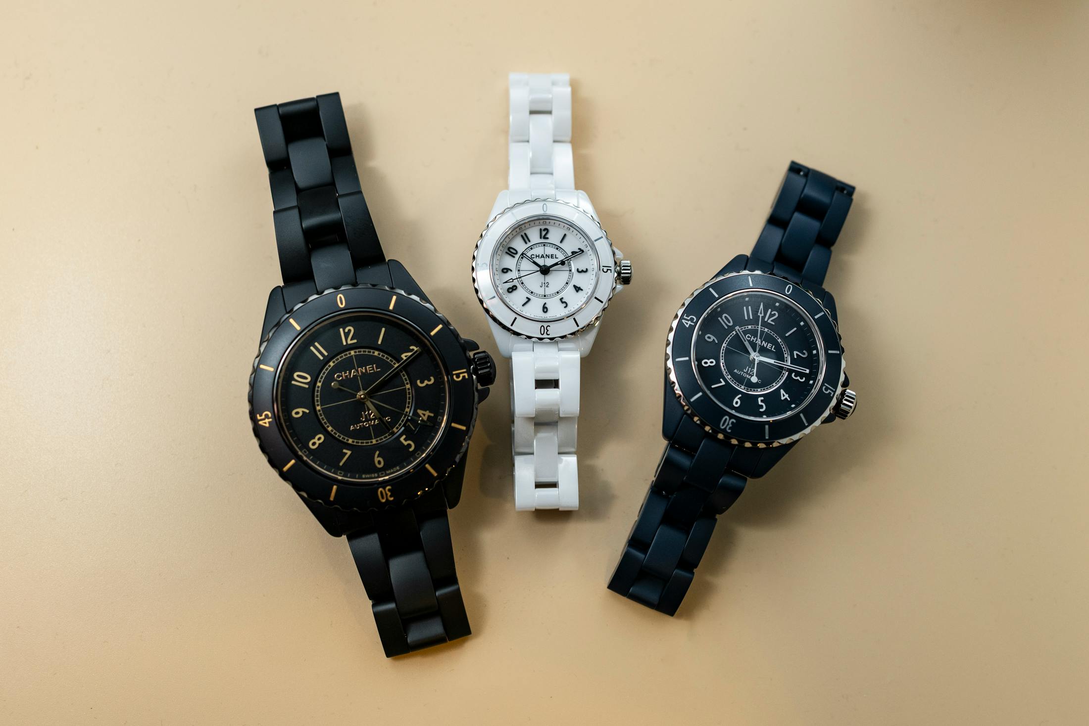 J12의 직경은 28mm, 33mm, 38mm, 42mm로 다양하며, 케이스 재질은 매트 블루, 매트 블랙, 블랙 또는 화이트의 고강도 세라믹으로 구성된다. 다이얼 색상은 매트 블루, 매트 블랙, 블랙 라커, 화이트 라커가 있으며, 인덱스는 스틸 또는 골드 도금된 마커로 적용되거나 선택된 모델에는 다이아몬드 세팅이 가능하다. 방수는 28mm 모델은 30m, 33mm, 38mm, 42mm 모델은 200m까지 가능하다.