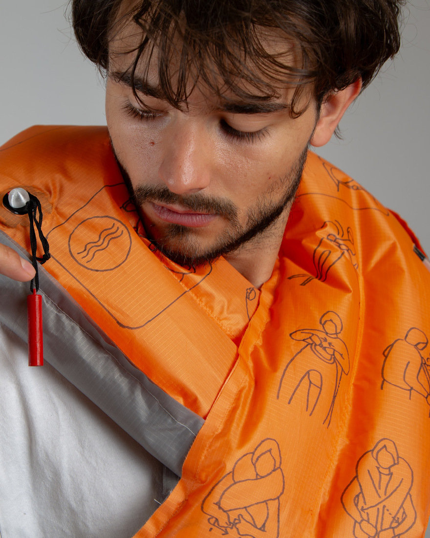 이 구명조끼는 복잡한 기술이 필요하지 않으며 개인의 필요에 맞게 조정할 수 있습니다. 비타팩에는 식량, 숯 정제, 응급처치 키트가 포함된 비상 패키지가 장착되어 있습니다. 또한, 마른 잎이나 풀로 채워질 경우 따뜻함을 제공하고, 자연 요소로부터 보호하며, 수면 매트로 사용할 수 있습니다. 구명조끼의 주황색 면을 바깥쪽으로 착용하면 가시성이 높아지며, 회색 면은 가시성이 덜 필요한 상황에서 사용할 수 있습니다.